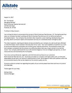 “I am writing this letter to recommend the services of North American Pipe Services, LLC. During the past four years our company has been working with North American Pipe Services, LLC on various private and municipal projects. Your company has provided video inspection, sewer cleaning, lateral grouting, joint grouting, lateral connection repairs and excavation services on a scheduled and/or emergency basis. The video inspection, cleaning and lateral services provided by your company on a job to job basis afforded us vital information which assisted in the execution of our work.” Read More
