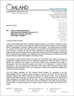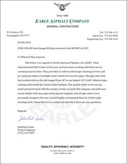 “This letter is in regards to North American Pipeline, LLC (NAP). I had subcontracted NAP in June of last year and have been working with them on my current project to date. They provided us with excellent pipe cleaning services and pre and post videos of multiple sized reinforced concrete pipes. The pipe sizes they had worked with on this job ranged from 18” to our largest 101”x160” elliptical pipe running underneath the Garden State Parkway. The quality of the work was top notch and performed with the essence of time in mind. The company and staff were overly helpful with any paperwork, payroll requests, and all pipe videos were personally dropped off to me. I would highly recommend them for further pipe cleaning work. Please feel free to contact me directly if there are any questions.”