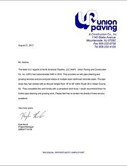 “This letter is in regards to North American Pipeline, LLC (NAP). Union Paving and Construction Co. Inc. (UPC) had subcontracted NAP in 2016. They provided us with pipe cleaning and grouting services and pre and post videos of multiple sized reinforced concrete pipes. The pipe sizes they had worked with on this job ranged from 18” to 48” within Route 35 in Ocean County, NJ. They completed the work timely with a competent work force. I would recommend them for further pipe cleaning and grouting work. Please feel free to contact me directly if there are any questions.” Read More