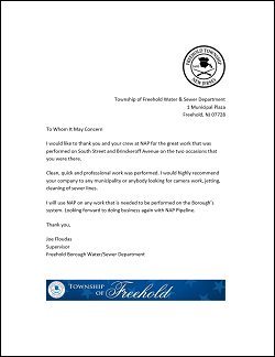 “I would like to thank you and your crew at NAP for the great work that was performed on South Street and Brinckeroff Avenue on the two occasions that you were there. Clean, quick and professional work was performed. I would highly recommend your company to any municipality or anybody looking for camera work, jetting, cleaning of sewer lines.” Read More