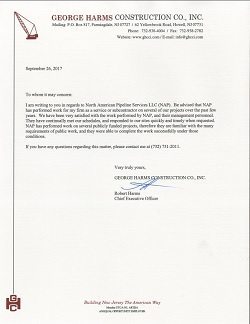 “I am writing to you in regards to North American Pipeline Services LLC (NAP). Be advised that NAP has performed work for my firm as a service or subcontractor on several of our projects over the past few years. We have been very satisfied with the work performed by NAP, and their management personnel. They have continually met our schedules, and responded to our sites quickly and timely when requested. NAP has performed work on several publicly funded projects, therefore they are familiar with the many requirements of public work, and they were able to complete the work successfully under those conditions.” Read More